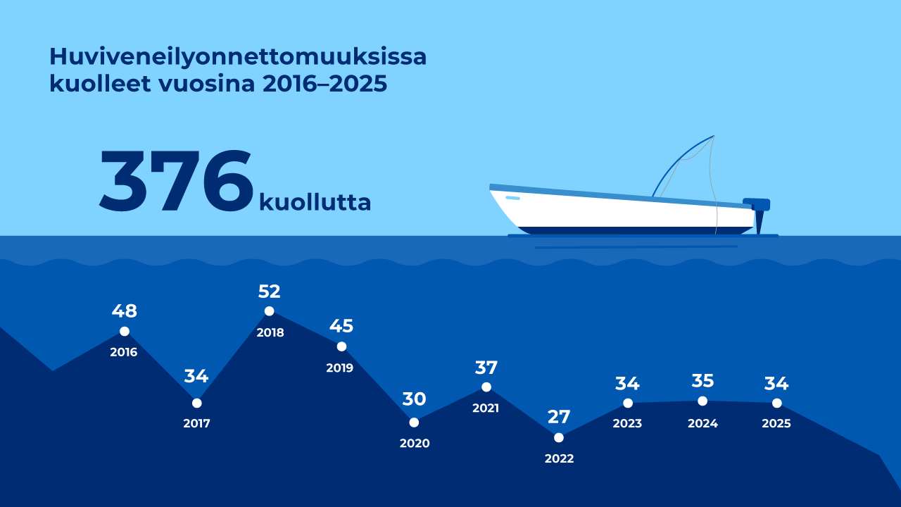 Liikenne- ja viestintävirasto Traficomin vuotta 2025 koskevista ennakkotilastoista selviää, että kuolemaan johtaneet huviveneilyonnettomuudet ovat viime vuosina vähentyneet. Vuonna 2025 huviveneonnettomuuksissa menehtyi 34 henkilöä.