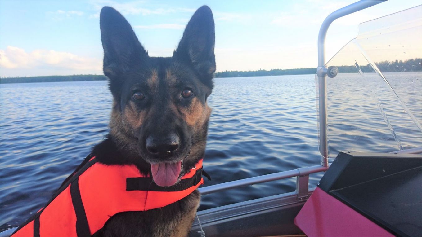 Merivartiokoira Cena on koulutettu henkilöetsintään, jäljestämiseen, huumausaine- ja esine-etsintään sekä ruumisetsintään merialueella.