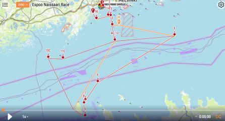 Liikkeelle lähdettiin kauniiseen, mutta kevyttuuliseen iltaan. Alle 5 m/s kaakkoistuuli kuitenkin piristyi illan ja yön mittaan niin, että kärkipään veneet pääsivät kunnon kyyteihin etelään kääntyneen 10 m/s tuulen puskemina kierrettyään väliaikapisteen Naissaaren eteläkärjessä.