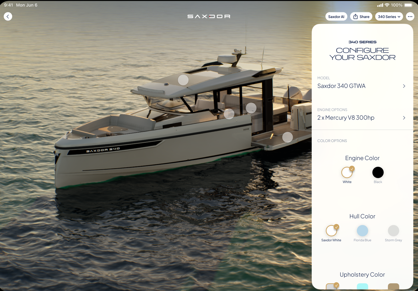 Saxdor panostaa vahvasti myös ostokokemuksen modernisointiin. Yhtiön Digital Showroom on kehitetty yhteistyössä suomalaisen Younite AI -yrityksen kanssa, ja se mahdollistaa veneiden yksityiskohtaisen tarkastelun, räätälöinnin ja 3D-visualisoinnin digitaalisena kaksosena.