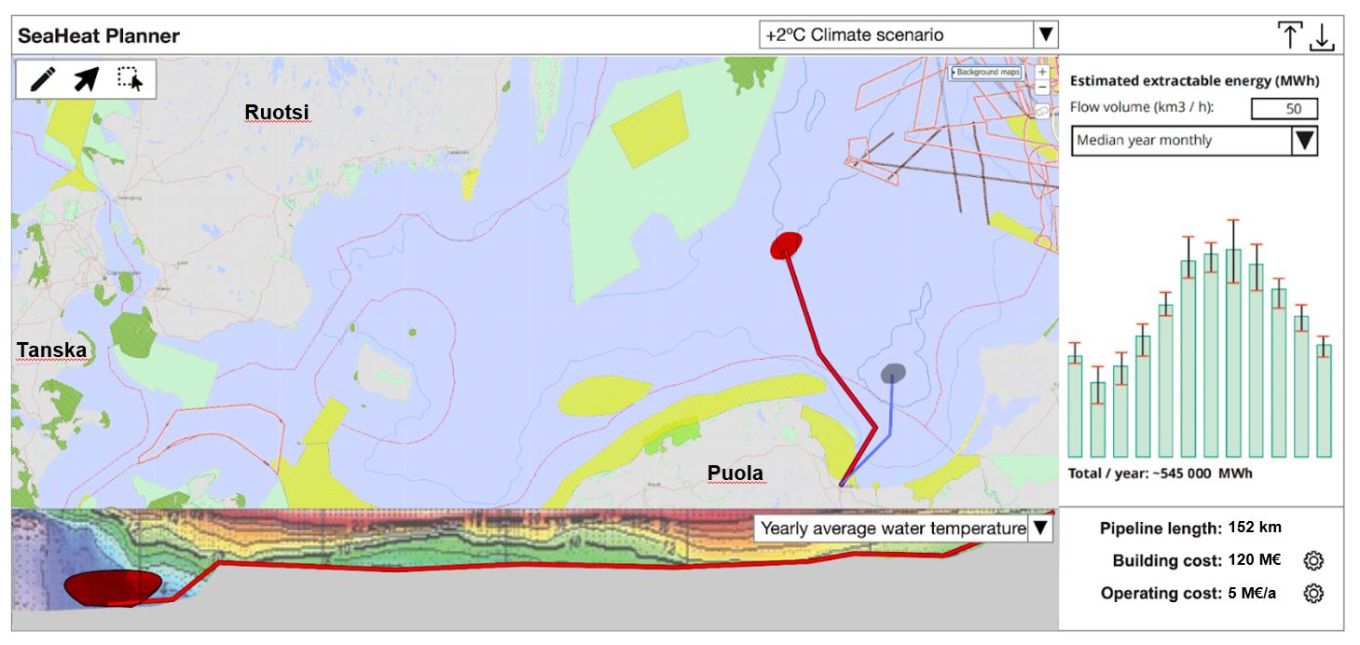 Hankkeessa luodaan avoimeen lähdekoodiin perustuva karttatyökalu (pääkuvassa), jonka avulla tuloksia voi käyttää halutulla alueella merilämpöpumppujen teknisen suunnittelun, investointien kannattavuuden sekä päästövähennysmahdollisuuksien arviointiin.