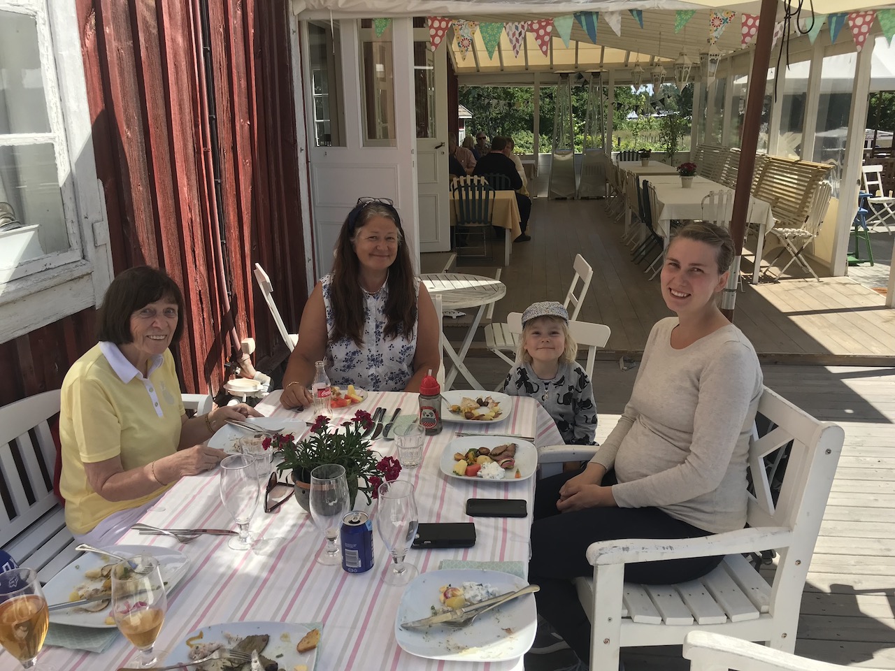 Me päätimme lähteä viettämään heinäkuista hellepäivää perheen tyttöjen kesken. Käytännössä se tarkoitti neljää sukupolvea samassa veneessä, ikähaitarin ollessa 3–84-vuotta. Retkikohteeksi valikoitui Högsåra, jossa odottaisi idyllisen Farmors Cafen kuuluisa viikonlopun kalapöytä.
